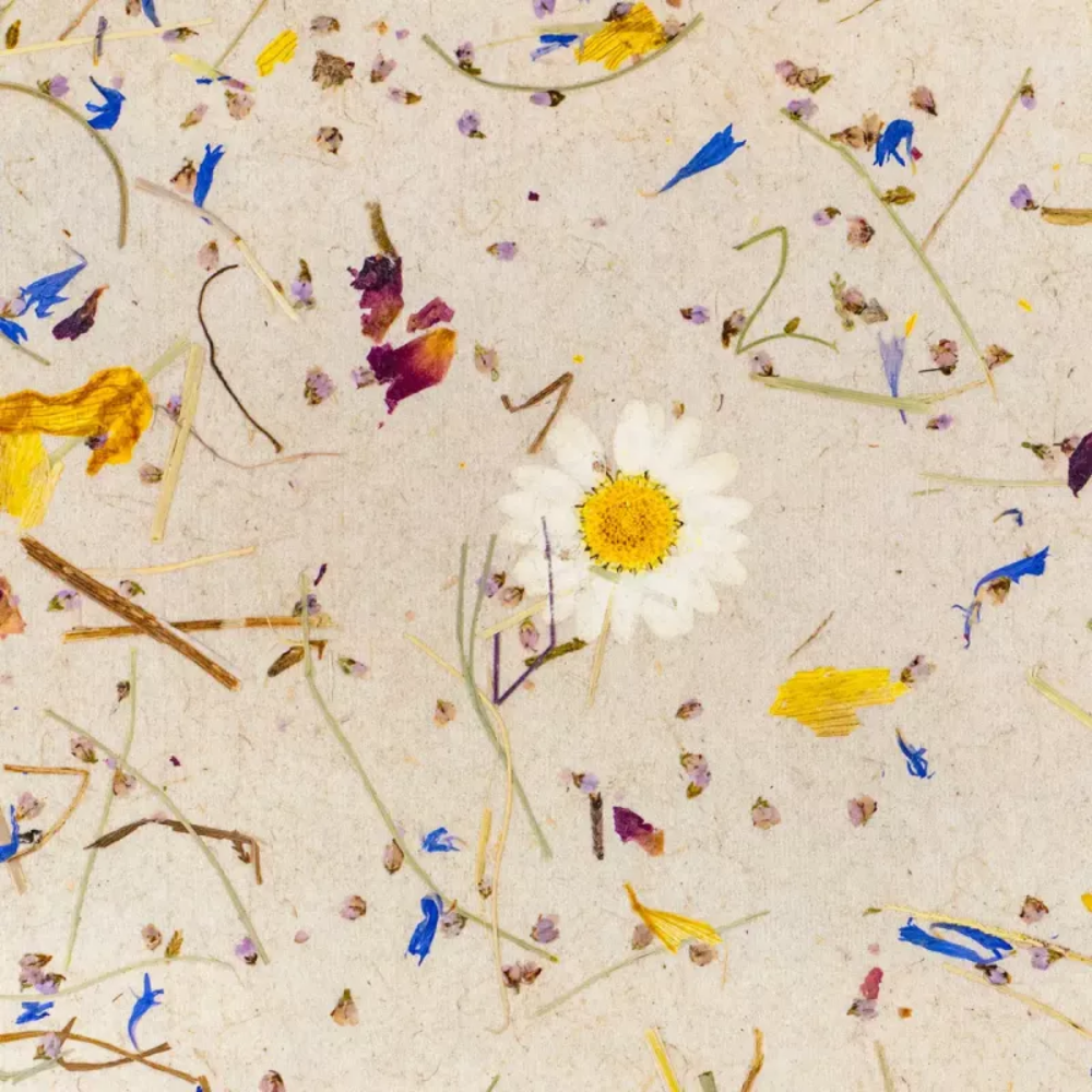 A4 Bastelbogen „Natur-Wohnen“ – Natürliches Flachsvlies mit leichter Heu-Struktur und Blütenblätter