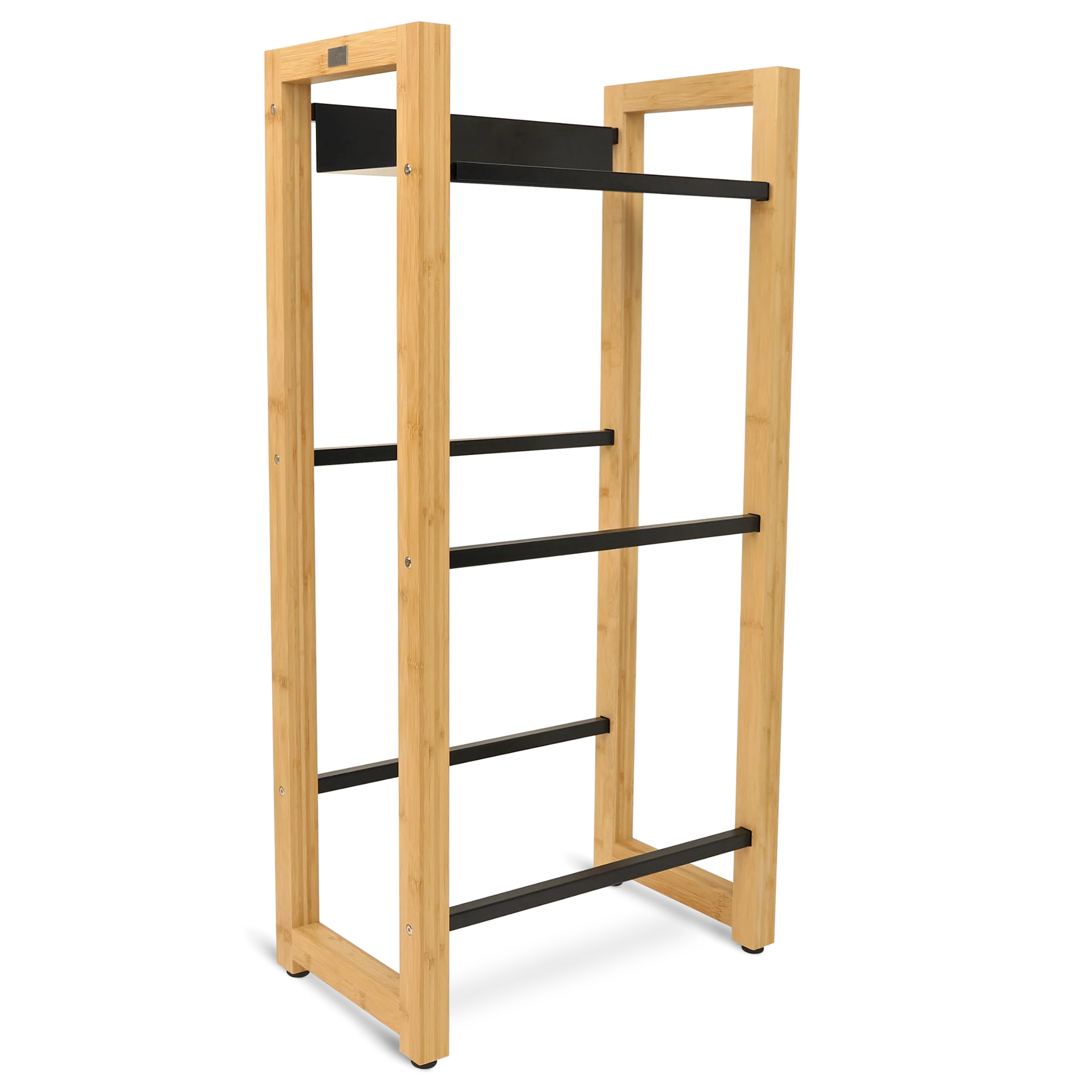 Die Rahmen der Getränkekistenregale bestehen aus Bambus, die Querstreben sind aus Schwarz pulverbeschichtetem Metall gefertigt.