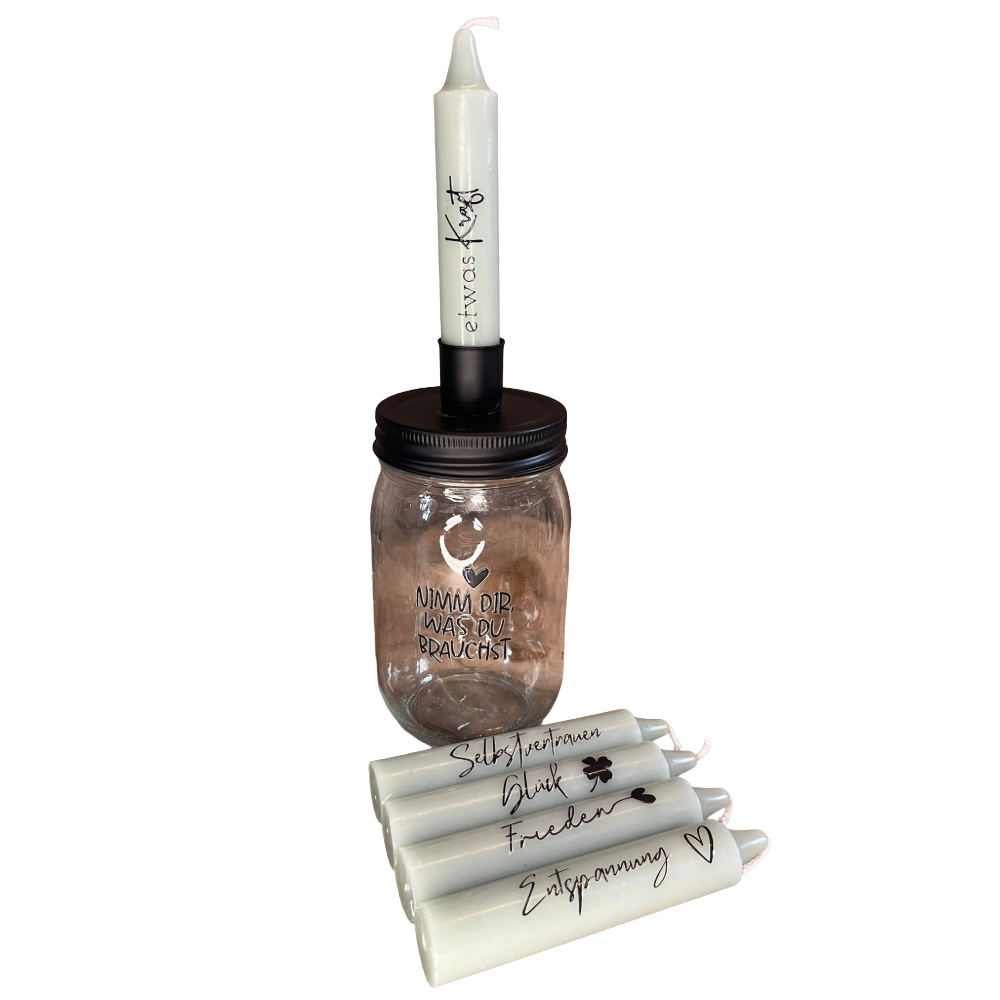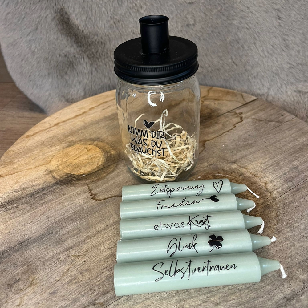 Kerzenglas „Nimm dir, was du brauchst“ – mit 5 individuellen Kerzen