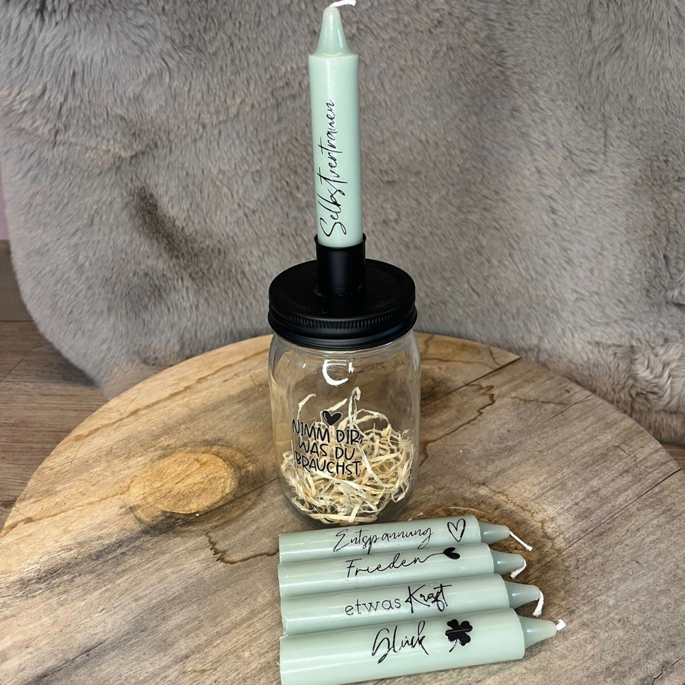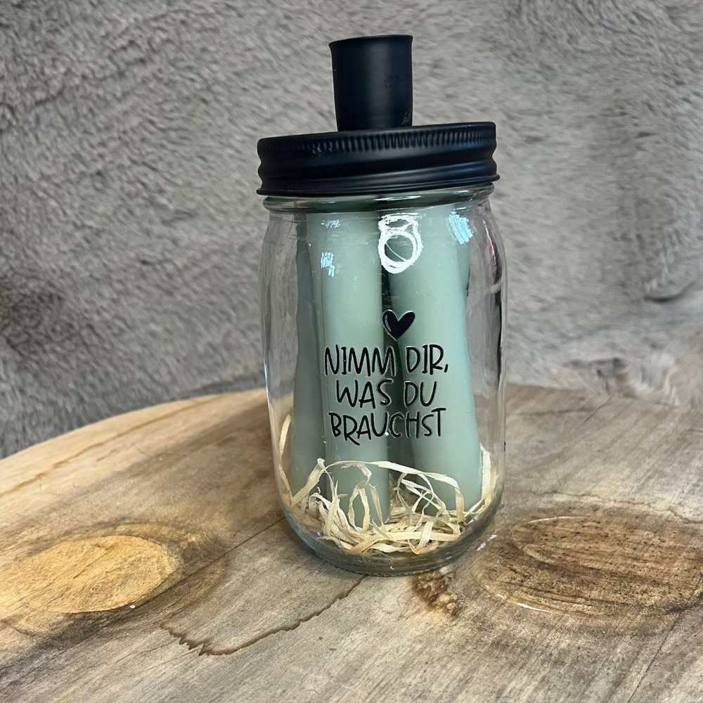 • Kerzenglas mit Aufdruck „Nimm dir, was du brauchst“