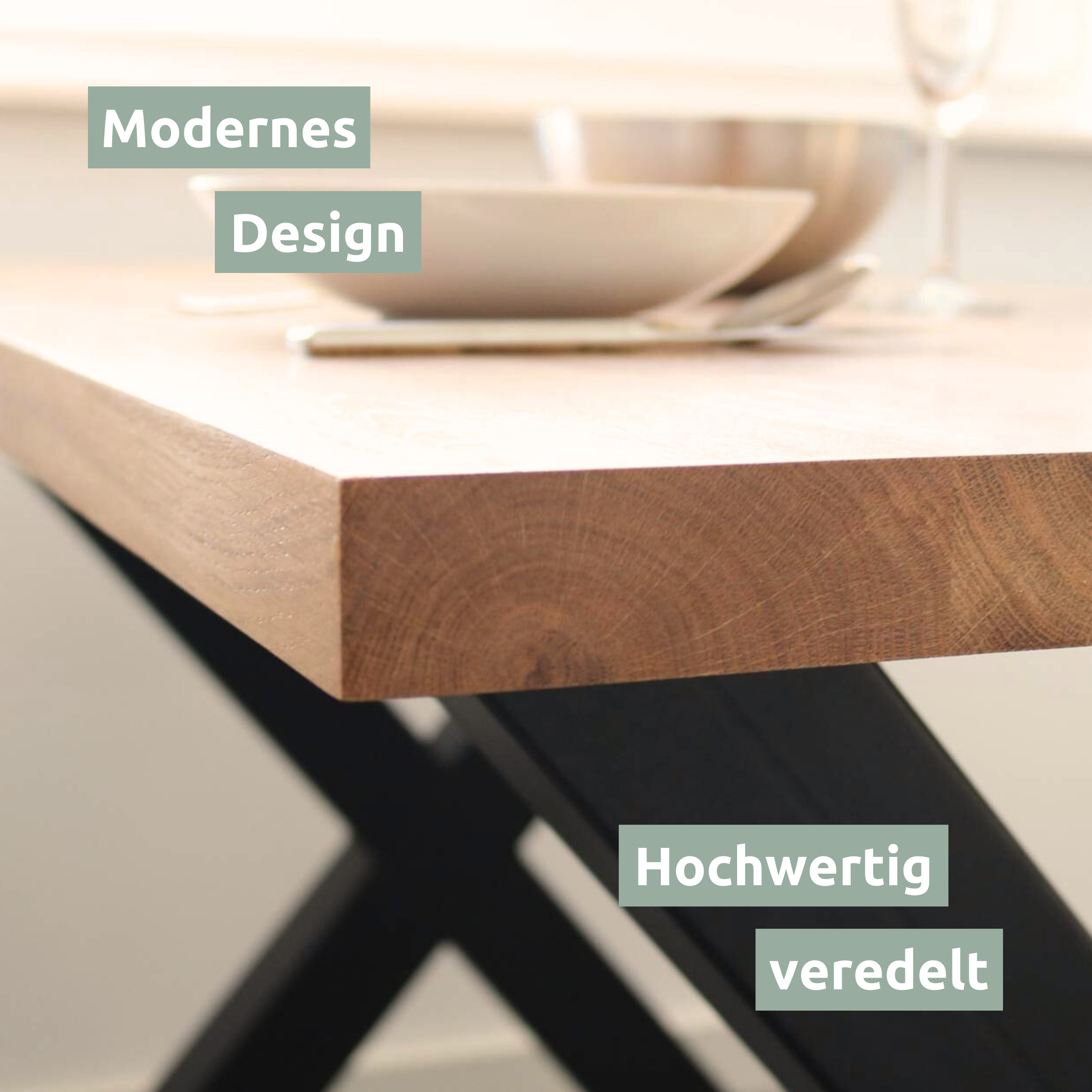 Egal ob als Esstisch, Schreibtisch oder Konferenztisch – diese Platte lässt sich mit Tischgestellen aus Holz oder Metall kombinieren. Die gerade Kante verleiht deinem Tisch ein modernes, elegantes Erscheinungsbild, das sich harmonisch in jedes Raumkonzept einfügt.