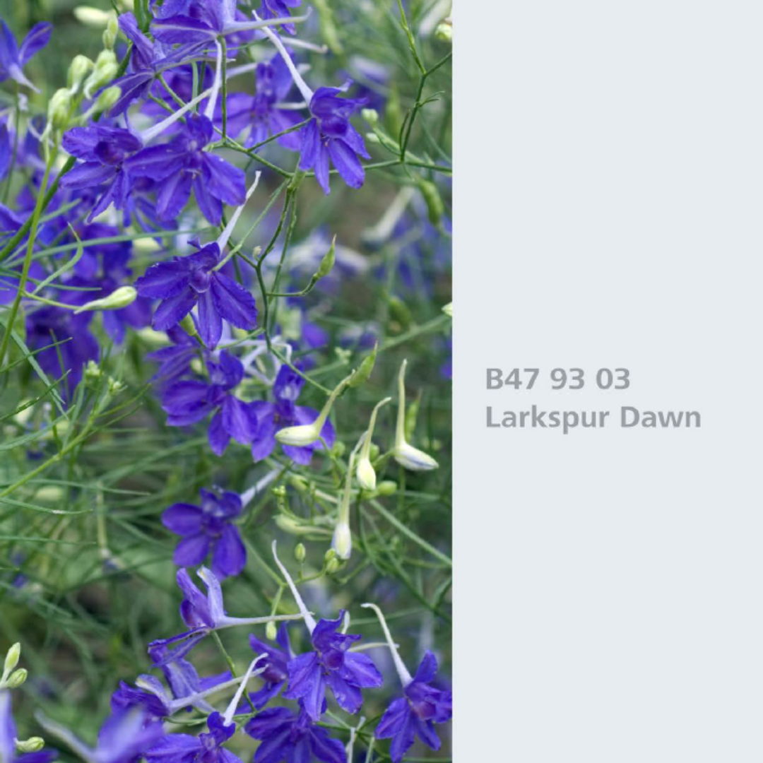 Larkspur Dawn ist ein zarter, kühler Blütenton mit weiter, luftiger Ausstrahlung. Inspiriert vom Feldrittersporn (Consolida regalis), dessen leuchtende Blüten einst für ihre natürlichen Farbpigmente geschätzt wurden, trägt dieser Farbton eine sanfte Frische in sich. Der historische Blütenfarbstoff Delphinidin steht sinnbildlich für die klare, bläulich-violette Nuance – modern interpretiert und fein ausbalanciert.