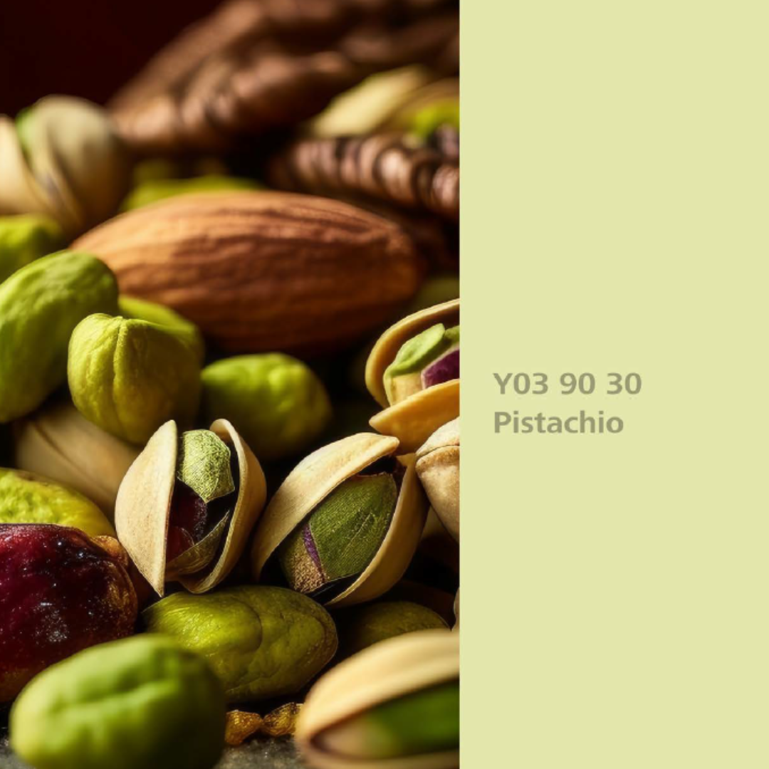 Als Farbton mit der Kennzeichnung „Assoziation“ basiert Pistachio auf der optischen und elektronischen Nachstellung der natürlichen Pistazienfarbe, ohne dass ein pflanzlicher Farbstoff generiert wurde. Die präzise Vermessung der Vorlage und die Rezeptur mit modernen Tönpasten ermöglichen eine authentische, zeitgemäße Interpretation dieses frischen Naturtons.