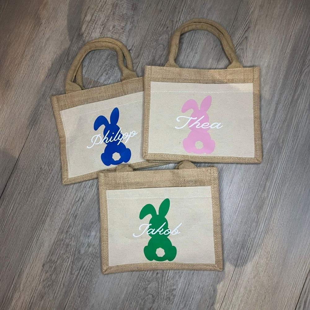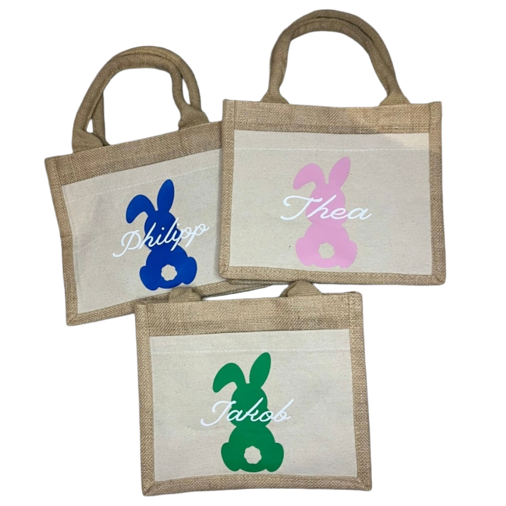 Die praktische Jutetasche eignet sich ideal als Ostertasche für Kinder, zum Sammeln von Ostereiern oder als besonderes Geschenk zu Ostern. Das süße Hasenmotiv mit Name macht jede Tasche zu einem echten Hingucker.