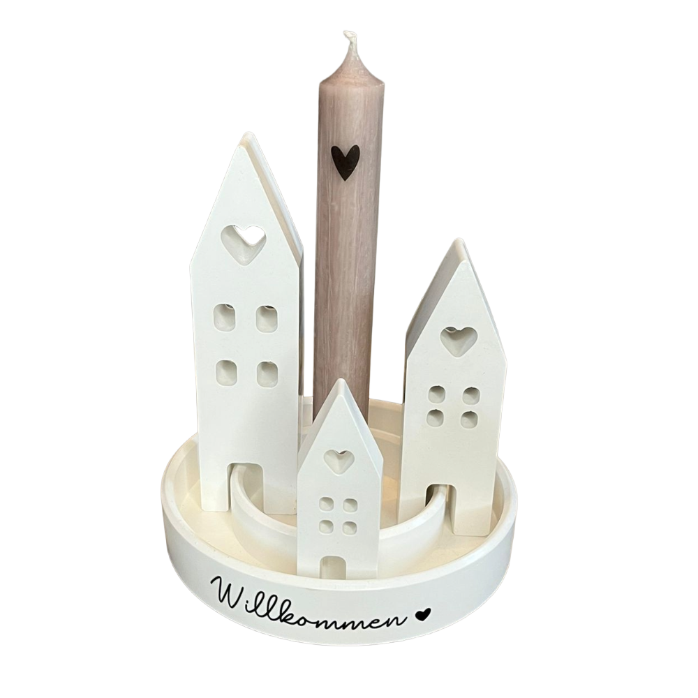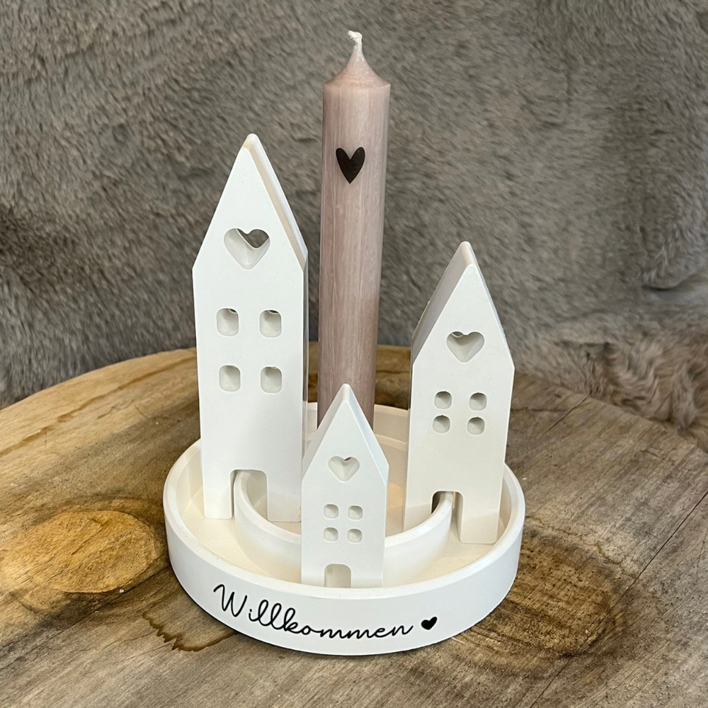 Runde Platte mit 3 Häusern – handgegossene Dekoration mit Kerze